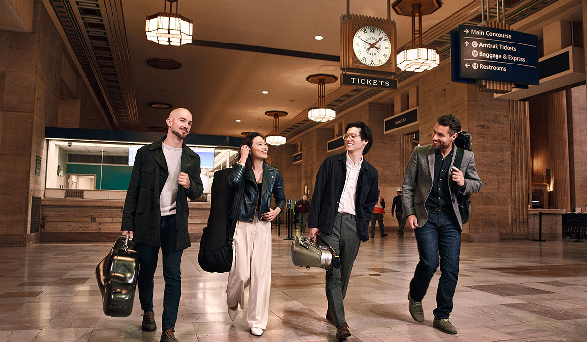 The Dover Quartet’s 2025-26 season features collaborative performances with preeminent artists including Marc-André Hamelin and Edgar Meyer, and performances in internationally renowned venues from Carnegie Hall to Kennedy Center to Konzerthaus Berlin. The quartet’s most recent commission is from Jerod Impichchaachaaha’ Tate, a citizen of the Chickasaw Nation and a leading composer of American Indian classical music. His new piece, Abokkoli’ Taloowa’ (Woodland Songs), is featured on Woodland Songs, the group’s most recent album, which also includes Tate’s new string-quartet orchestration of Rattle Songs by the Indigenous singer Pura Fé, originally for her a cappella vocal group Ulali. Dvořák’s “American” Quartet, a classic of the repertoire, completes the album, released in August 2025 on the Curtis Studio label.